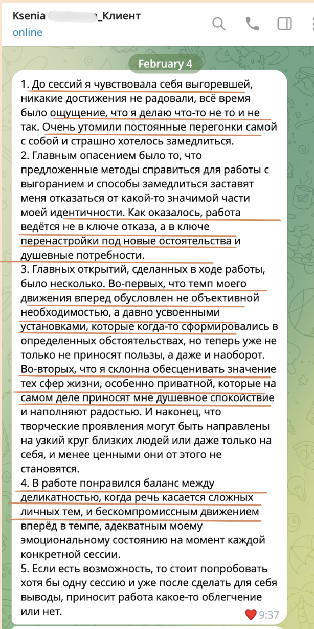"I came to you when I was completely exhausted. I felt like I had lost myself and could not see a way out. My job brought me no joy, my head was constantly buzzing, and I did not have the energy for even the simplest tasks. At our first meeting you saw what was happening — and showed me a real plan to get out of it. It gave me back my motivation. I now have goals in my career and life, and the strength to pursue them. Thank you!"